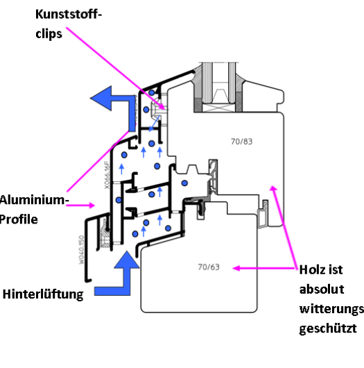 Die Montage erfolgt ausschließlich von außen d.h. die Kunststoffclips werden am Holzrahmen befestigt, sodass der Alurahmen exakt auf das Holzfenster montiert werden kann.